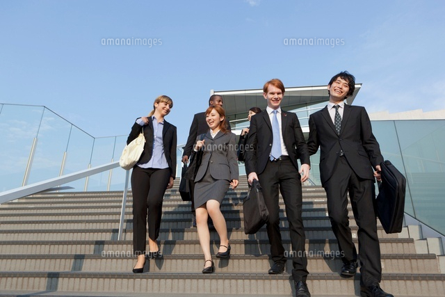 階段を降りるスーツ姿の男女4人 の写真素材 イラスト素材 アマナイメージズ